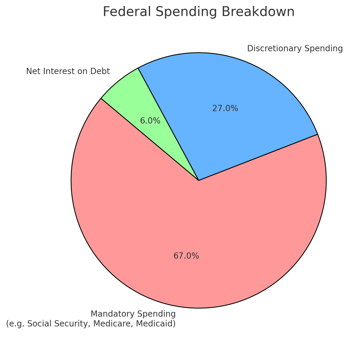 Federal spending falls into two main categories: mandatory and discretionary. Mandatory spending, which makes up about two-thirds of federal spending, is required by existing laws such as Social Security and Medicare. It doesn't need annual Congressional approval. Discretionary spending, on the other hand, requires annual approval through the Congressional appropriations process and primarily funds defense and various federal agencies. (There are also supplemental appropriations, which address unexpected needs during the fiscal year.)