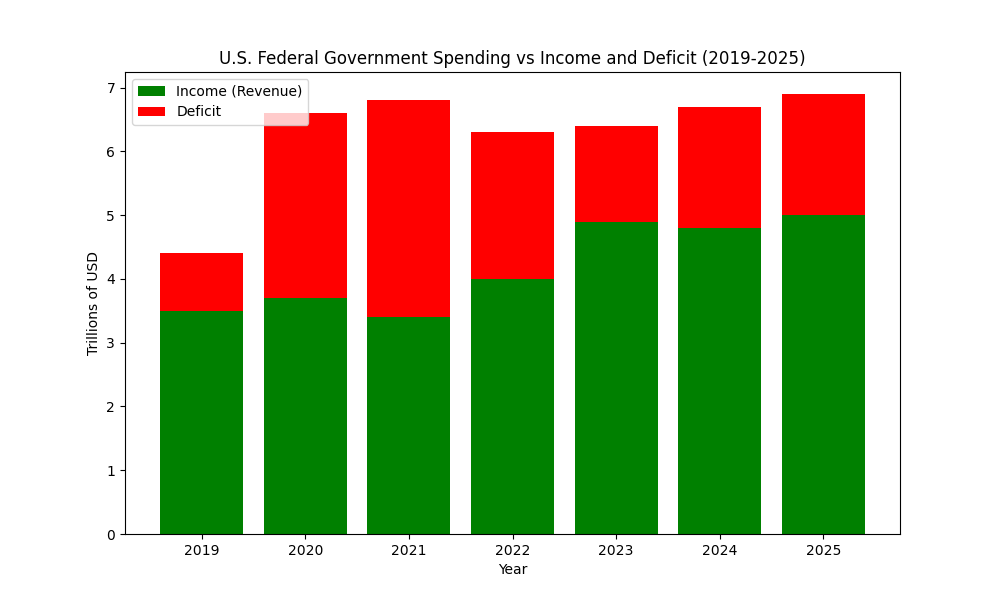 The next chart correlates to the chart above, except it shows how much of the expenses are actually covered by income. The rest is added to the national debt every year.