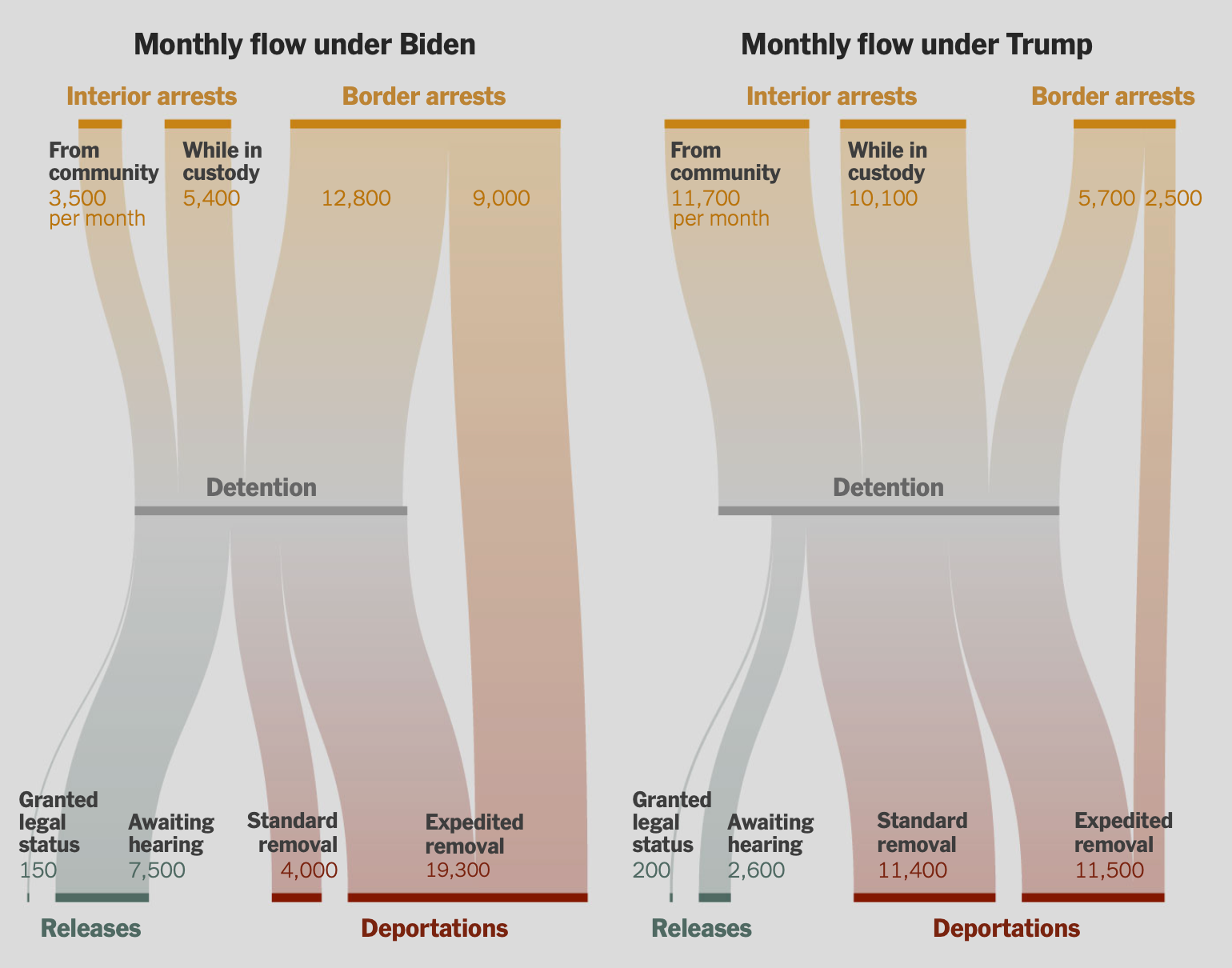 After being arrested, detainees are moved to detention centers, then to a deportation hub. Deportations from the interior of the United States now outnumber apprehensions at the border for the first time since at least 2014.