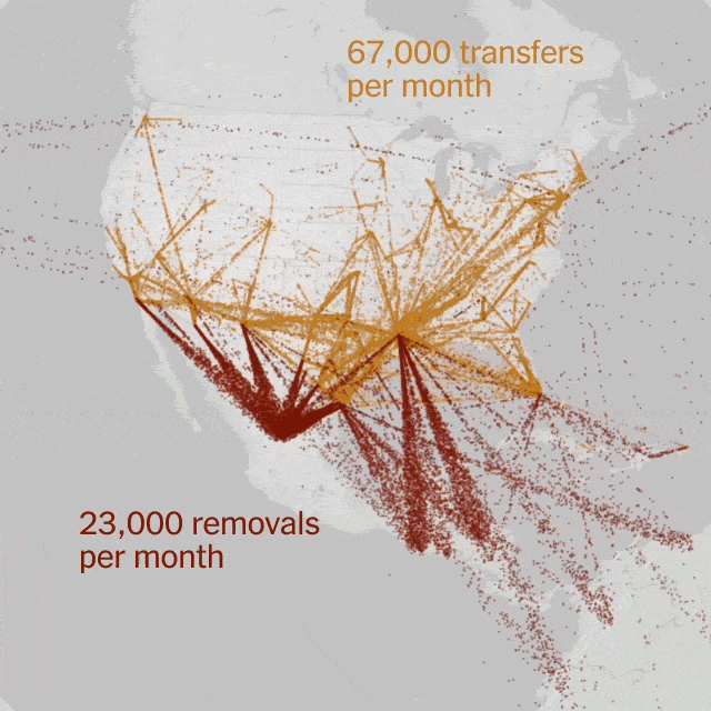 On the map below, each dot represents the movement of someone arrested or deported by Immigration and Customs Enforcement this year.
