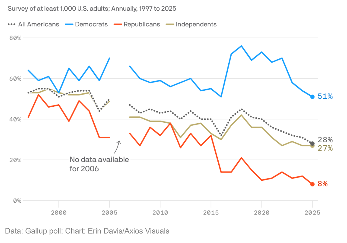 📰 Media Trust Hits Record Low: Only 28% of Americans say they have a great deal or a fair amount of trust in mass media, down from 68% in 1972, according to a new Gallup survey, which marks the third consecutive year of record lows. The partisan gap remains stark, with 51% of Democrats and just 8% of Republicans expressing trust in media. 62% of Republicans say they have “no trust at all.”
