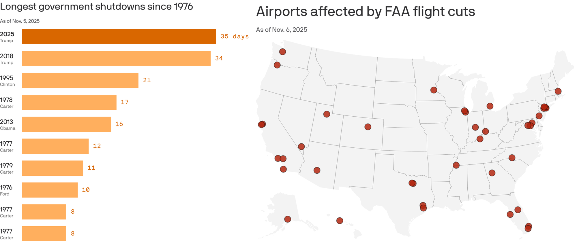 ✈️ Government Shutdown Forces Flight Cancellations: As Day 39 of the shutdown dawns, this is now the longest shutdown in U.S. history, breaking the record set in the 2018-2019 shutdown during President Trump's first term. The FAA ordered airline traffic to be reduced by 10% at 40 airports while air-traffic controllers work without pay, with cuts ramping up as Thanksgiving approaches. On Friday, a 4% reduction in operations took effect, which will ramp up to 6% by Tuesday, 8% by November 13 and 10% by November 14, the FAA says.