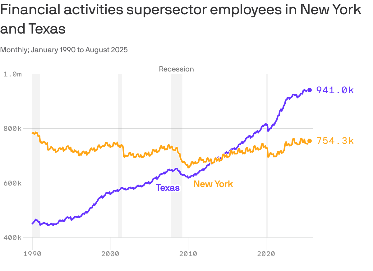 💸 Wall Street Leaves New York: From 2020 to 2023, more than 150 financial firms managing nearly $1 trillion moved their headquarters out of New York. Floriday and Texas have been popular relocation destinations. The election of Zohran Mamdani shows how much the city's identity has changed from just over a decade ago, when the mayor was Michael Bloomberg, a billionaire who made his fortune on Wall Street. Do you know what they call the emerging financial district in Texas? “Y’all Street!” (Actually not a joke.)