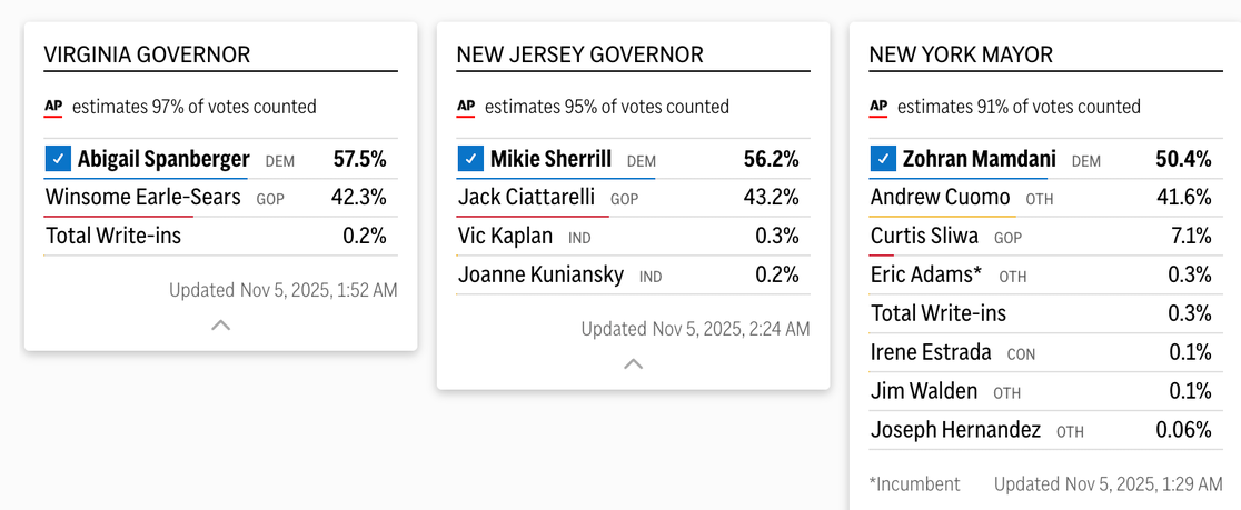 - New Jersey Governor: Democrat Mikie Sherrill cruised to victory by over 400,000 votes, besting Republican Jack Ciattarelli in a race that polls had projected would be neck and neck. Sherrill and aligned groups invested $61 million on ad spots since June, compared to $41 million by Ciattarelli and GOP groups. The New Jersey governor's race topped three million votes for the first time.