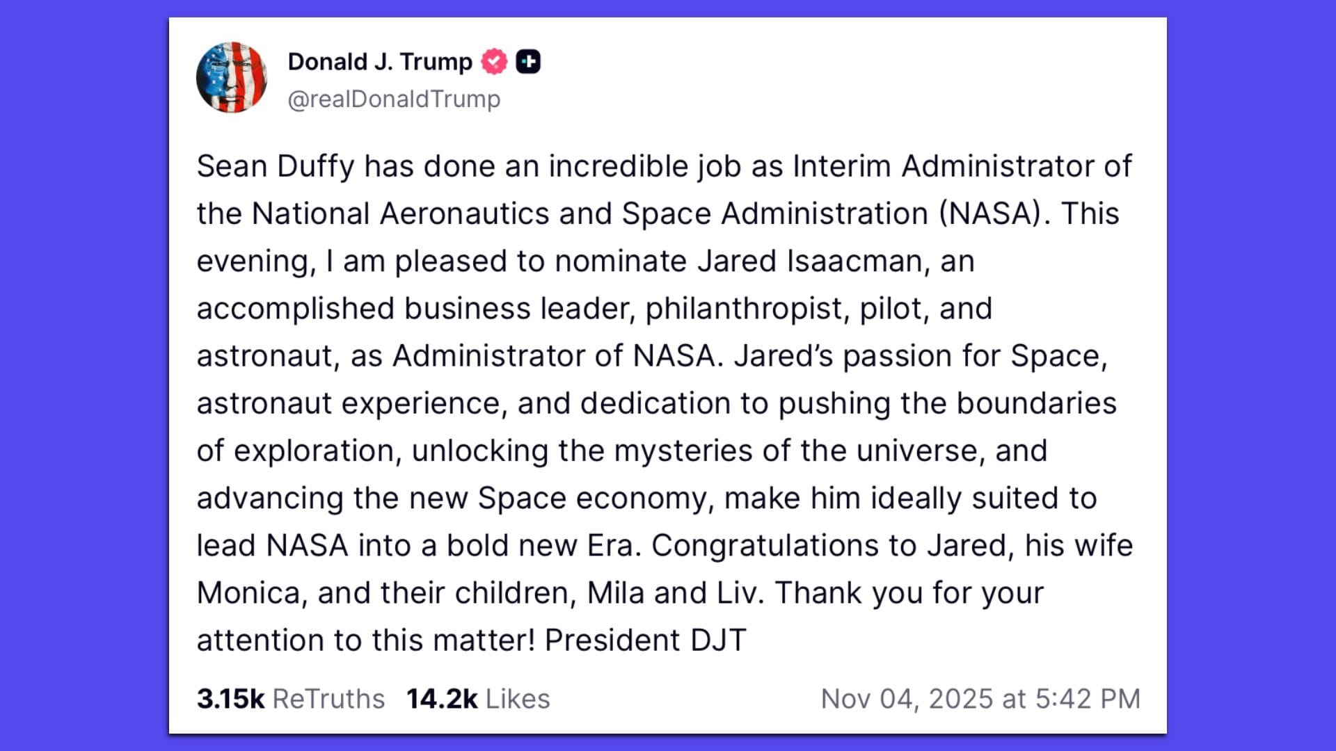 🚀 Trump Restores NASA Nominee: President Trump ended a fierce behind-the-scenes tussle and restored Jared Isaacman as his nominee to run NASA months after abruptly canceling his nomination earlier this year after a feud with Elon Musk.