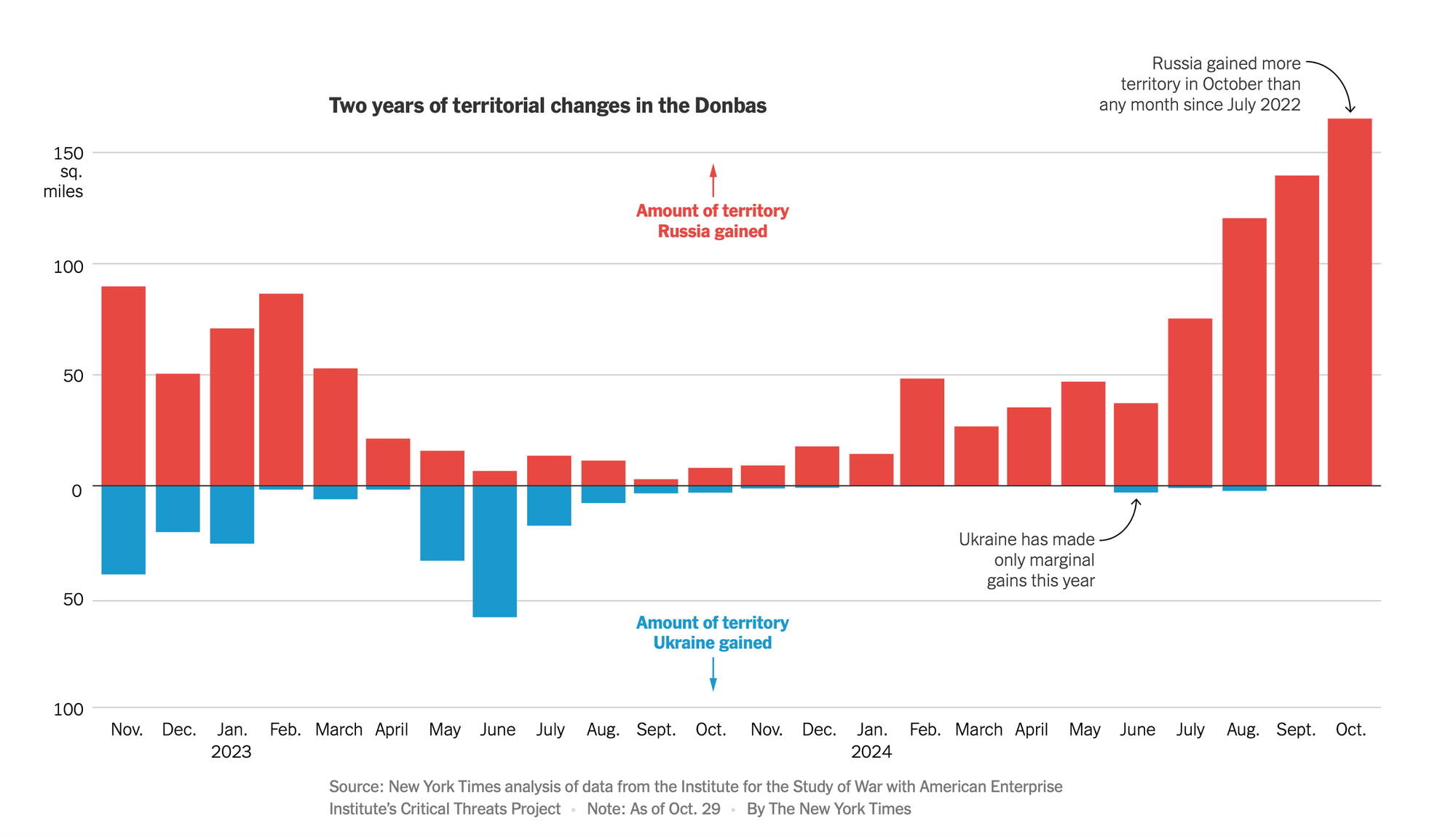 This comes as The New York Times reports that “in October, Russia made its largest territorial gains since the summer of 2022, as Ukrainian lines buckled under sustained pressure.”