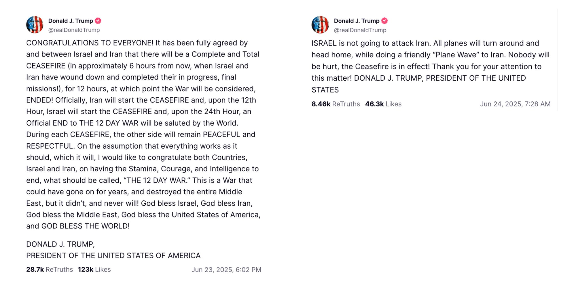 - President Trump announced Monday evening in Washington that Israel and Iran had reached a formal agreement to implement a complete and total ceasefire.