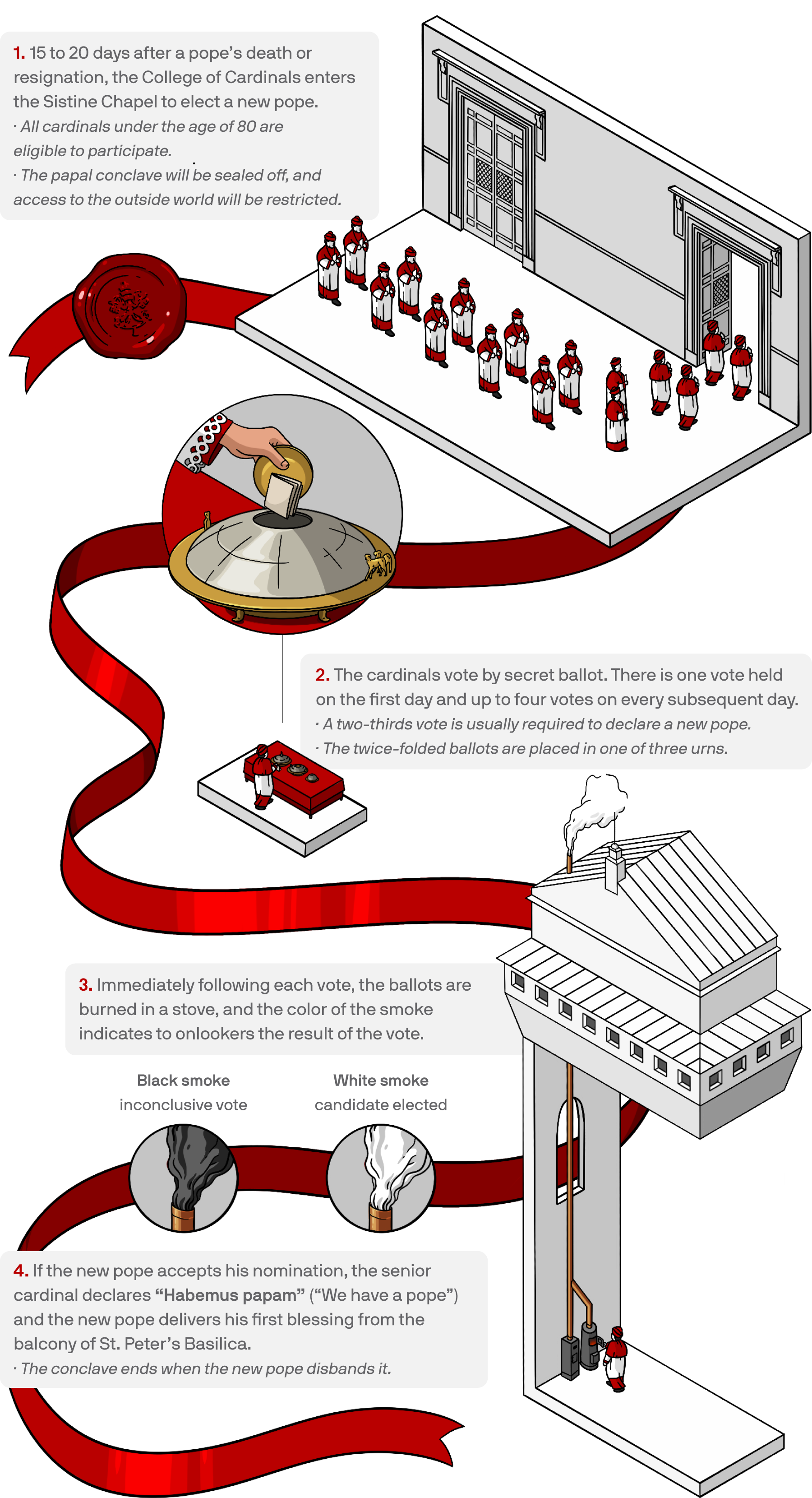 The world will watch for the telltale smoke signals from the chapel's chimney—black smoke indicating an inconclusive vote, white smoke announcing a new pontiff. (Black smoke is achieved by adding potassium perchlorate, anthracene, and sulfur to the burning ballots. White smoke is produced by using potassium chlorate, lactose, and chloroform resin.) When selected, the senior cardinal will declare, “Habemus papam” ("We have a pope"), before the new leader emerges on the balcony of St. Peter's Basilica.
